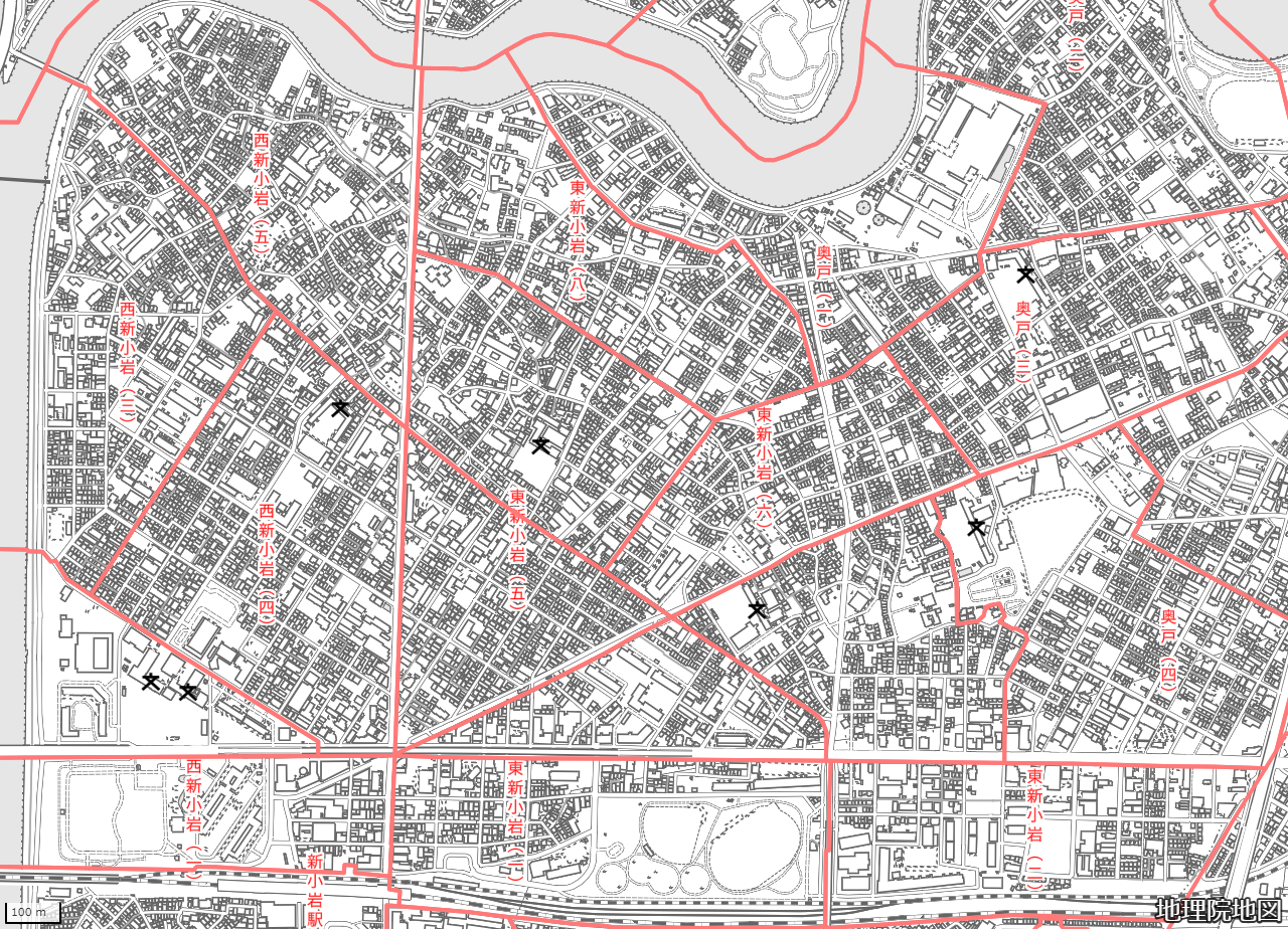 境界付近に建物が存在しない場合や、河川や海岸がある場合には、地図全体の視認性を高める為に一部境界を省略している場合がございます。