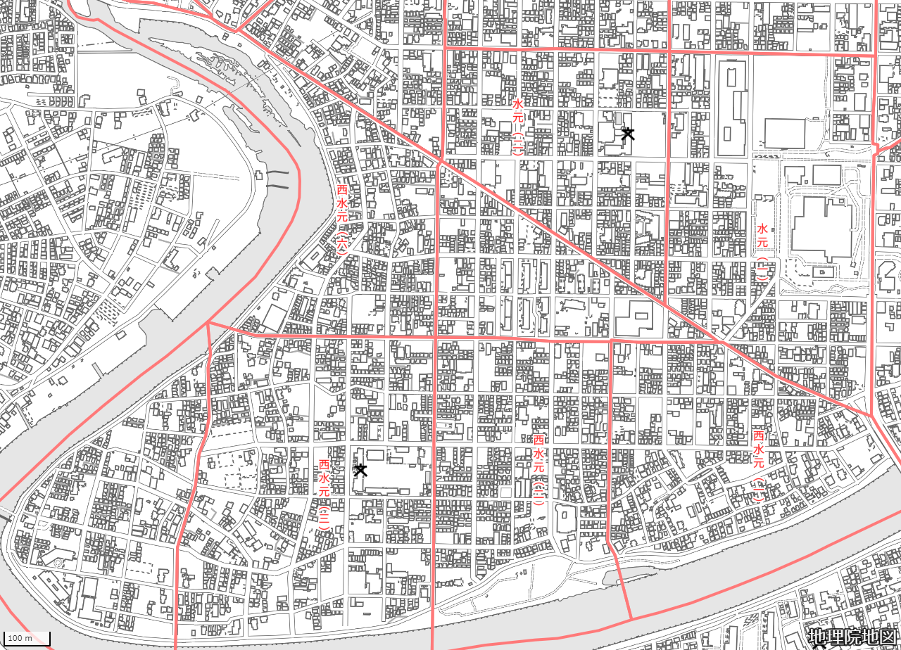 地図の内容は国土地理院が作成した時点の情報を反映しており、実際の現況とは異なる場合があります。現在は存在しない建物や道路、新たに整備された施設などが含まれることがありますので、あらかじめご了承ください。