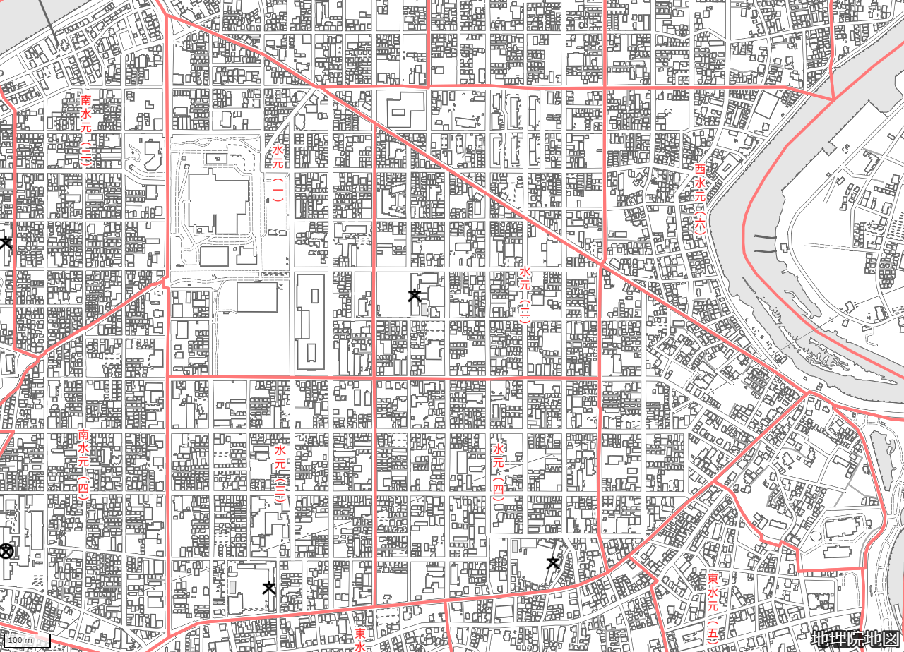 地図の内容は国土地理院が作成した時点の情報を反映しており、実際の現況とは異なる場合があります。現在は存在しない建物や道路、新たに整備された施設などが含まれることがありますので、あらかじめご了承ください。