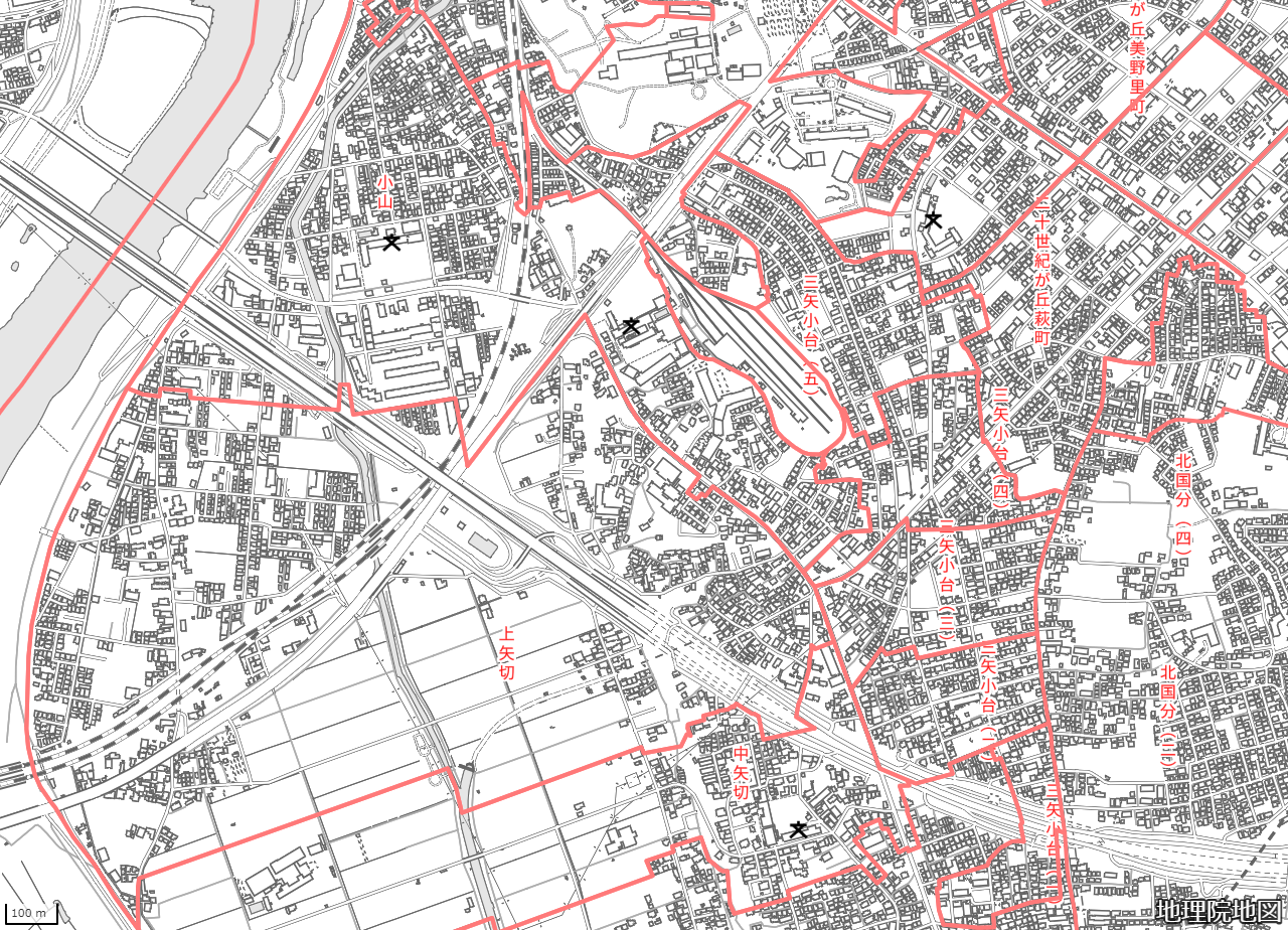 地図の内容は国土地理院が作成した時点の情報を反映しており、実際の現況とは異なる場合があります。現在は存在しない建物や道路、新たに整備された施設などが含まれることがありますので、あらかじめご了承ください。