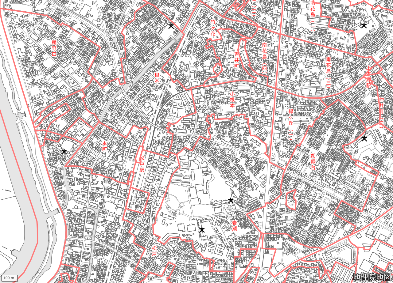 境界付近に建物が存在しない場合や、河川や海岸がある場合には、地図全体の視認性を高める為に一部境界を省略している場合がございます。