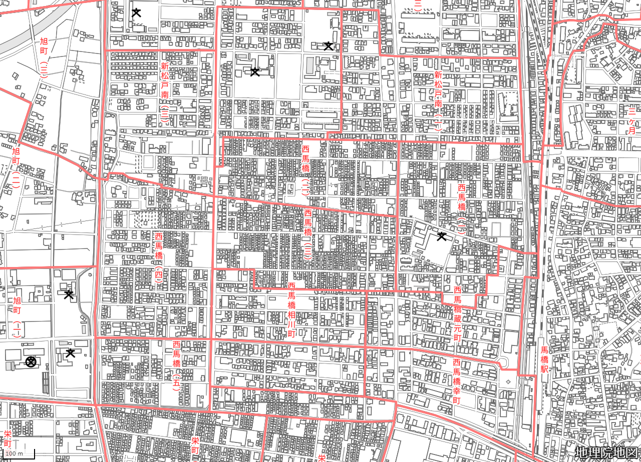 地図の内容は国土地理院が作成した時点の情報を反映しており、実際の現況とは異なる場合があります。現在は存在しない建物や道路、新たに整備された施設などが含まれることがありますので、あらかじめご了承ください。