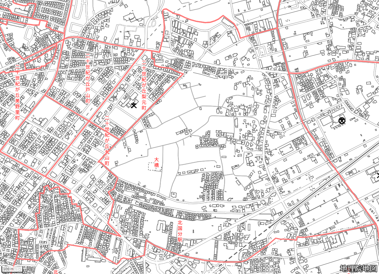 地図の内容は国土地理院が作成した時点の情報を反映しており、実際の現況とは異なる場合があります。現在は存在しない建物や道路、新たに整備された施設などが含まれることがありますので、あらかじめご了承ください。