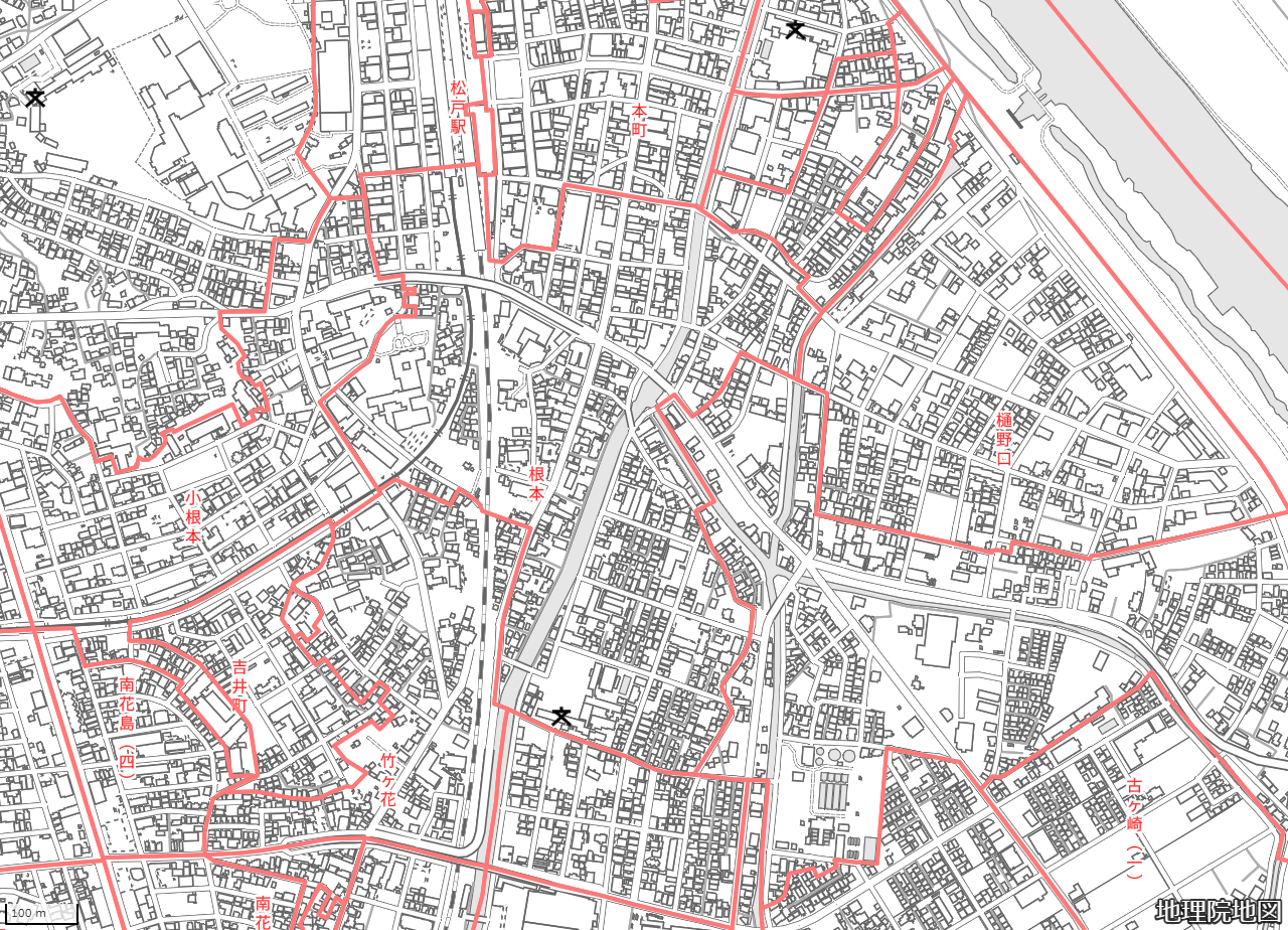 境界付近に建物が存在しない場合や、河川や海岸がある場合には、地図全体の視認性を高める為に一部境界を省略している場合がございます。