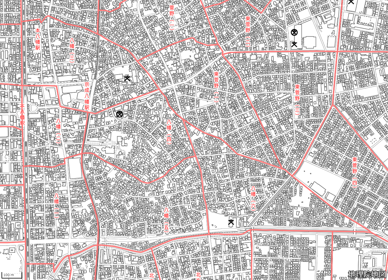 地図の内容は国土地理院が作成した時点の情報を反映しており、実際の現況とは異なる場合があります。現在は存在しない建物や道路、新たに整備された施設などが含まれることがありますので、あらかじめご了承ください。