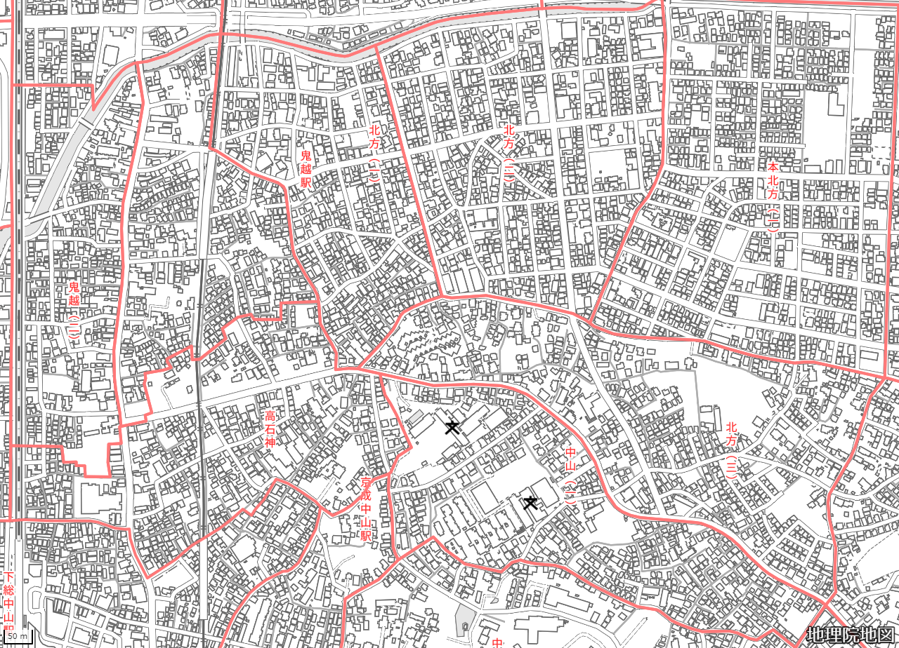 地図の内容は国土地理院が作成した時点の情報を反映しており、実際の現況とは異なる場合があります。現在は存在しない建物や道路、新たに整備された施設などが含まれることがありますので、あらかじめご了承ください。