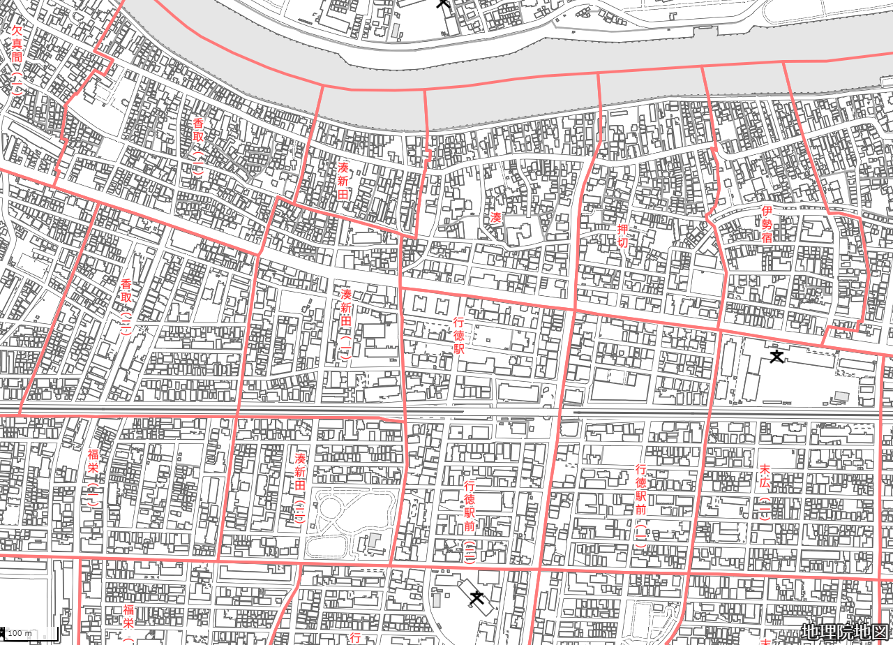 境界付近に建物が存在しない場合や、河川や海岸がある場合には、地図全体の視認性を高める為に一部境界を省略している場合がございます。
