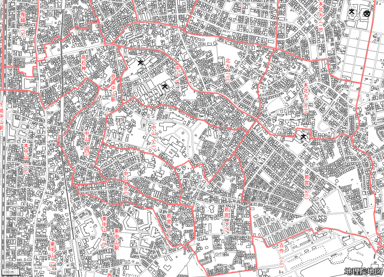 地図の内容は国土地理院が作成した時点の情報を反映しており、実際の現況とは異なる場合があります。現在は存在しない建物や道路、新たに整備された施設などが含まれることがありますので、あらかじめご了承ください。
