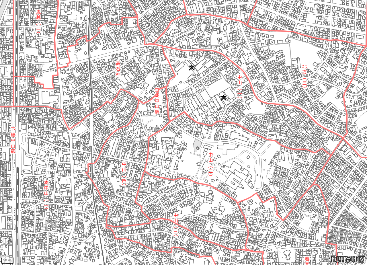 地図の内容は国土地理院が作成した時点の情報を反映しており、実際の現況とは異なる場合があります。現在は存在しない建物や道路、新たに整備された施設などが含まれることがありますので、あらかじめご了承ください。