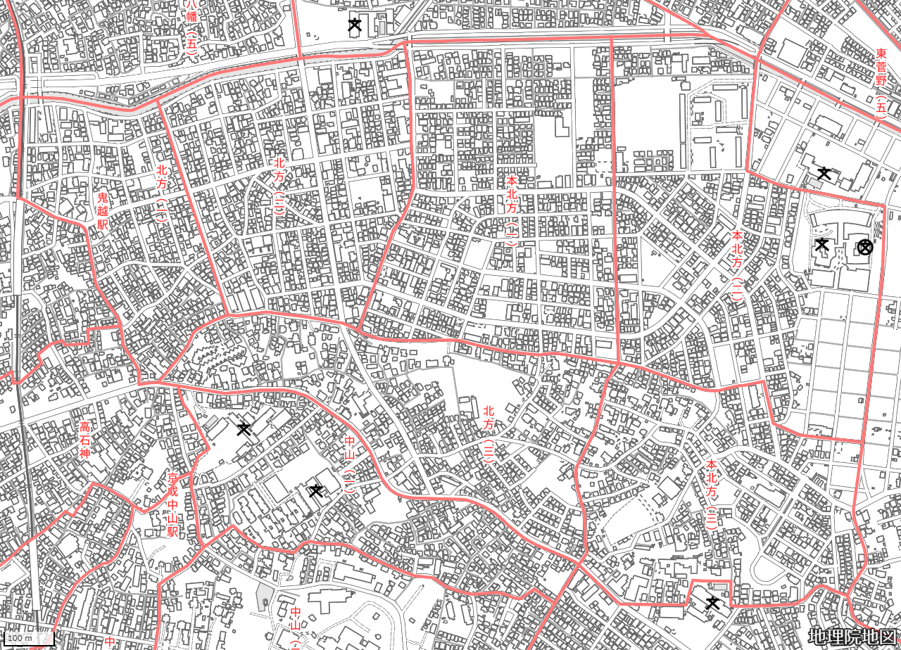 地図の内容は国土地理院が作成した時点の情報を反映しており、実際の現況とは異なる場合があります。現在は存在しない建物や道路、新たに整備された施設などが含まれることがありますので、あらかじめご了承ください。