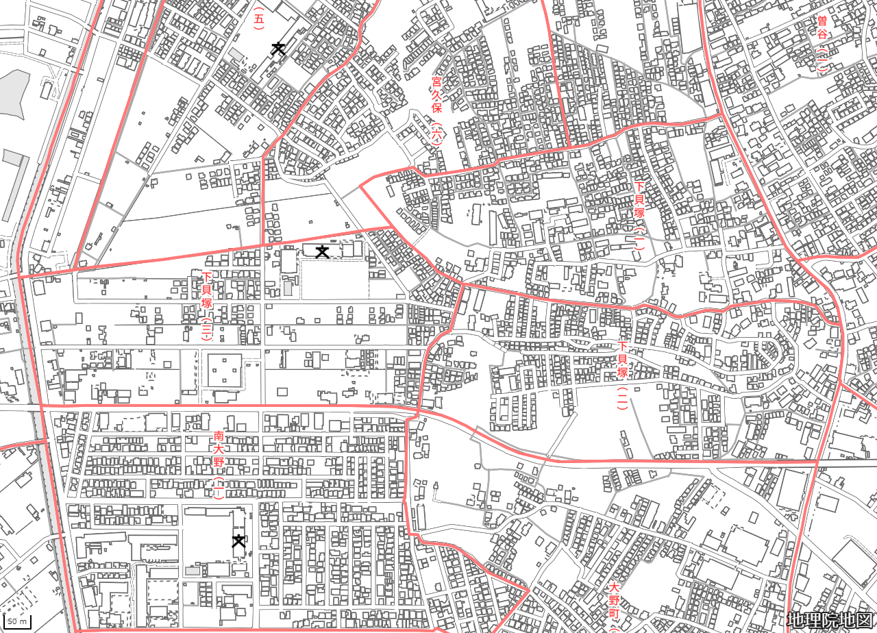 地図の内容は国土地理院が作成した時点の情報を反映しており、実際の現況とは異なる場合があります。現在は存在しない建物や道路、新たに整備された施設などが含まれることがありますので、あらかじめご了承ください。
