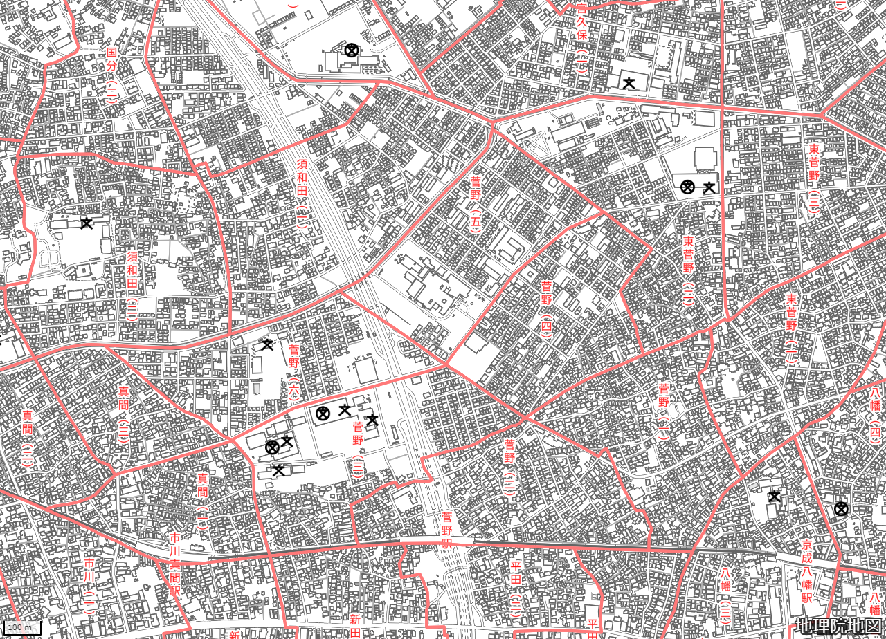 地図の内容は国土地理院が作成した時点の情報を反映しており、実際の現況とは異なる場合があります。現在は存在しない建物や道路、新たに整備された施設などが含まれることがありますので、あらかじめご了承ください。