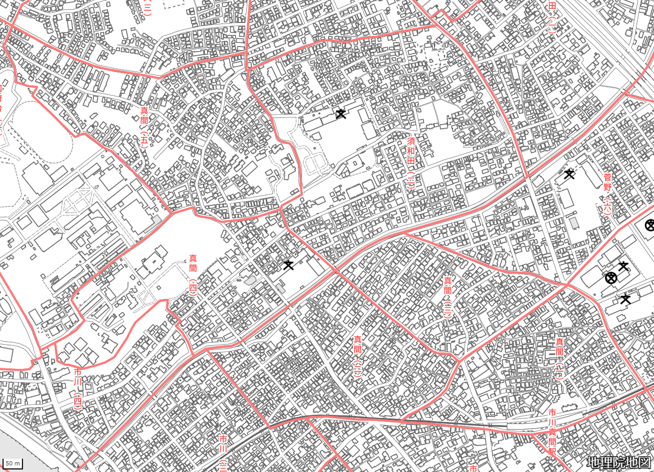 地図の内容は国土地理院が作成した時点の情報を反映しており、実際の現況とは異なる場合があります。現在は存在しない建物や道路、新たに整備された施設などが含まれることがありますので、あらかじめご了承ください。