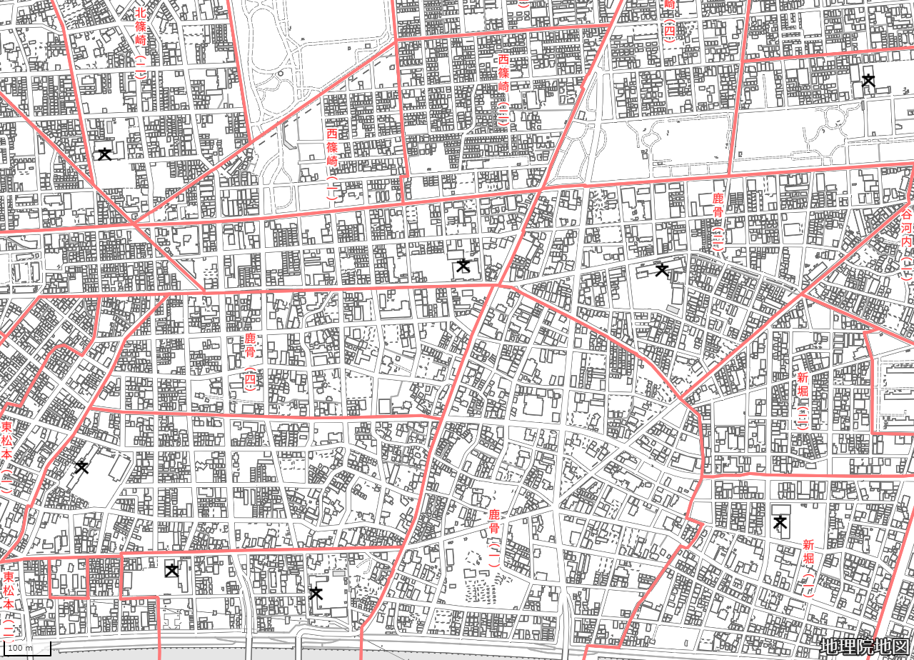 地図の内容は国土地理院が作成した時点の情報を反映しており、実際の現況とは異なる場合があります。現在は存在しない建物や道路、新たに整備された施設などが含まれることがありますので、あらかじめご了承ください。