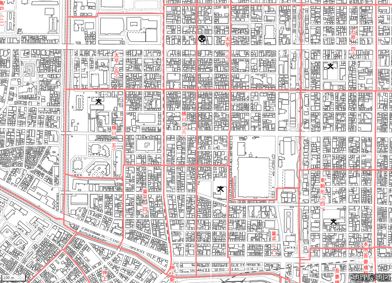 地図の内容は国土地理院が作成した時点の情報を反映しており、実際の現況とは異なる場合があります。現在は存在しない建物や道路、新たに整備された施設などが含まれることがありますので、あらかじめご了承ください。