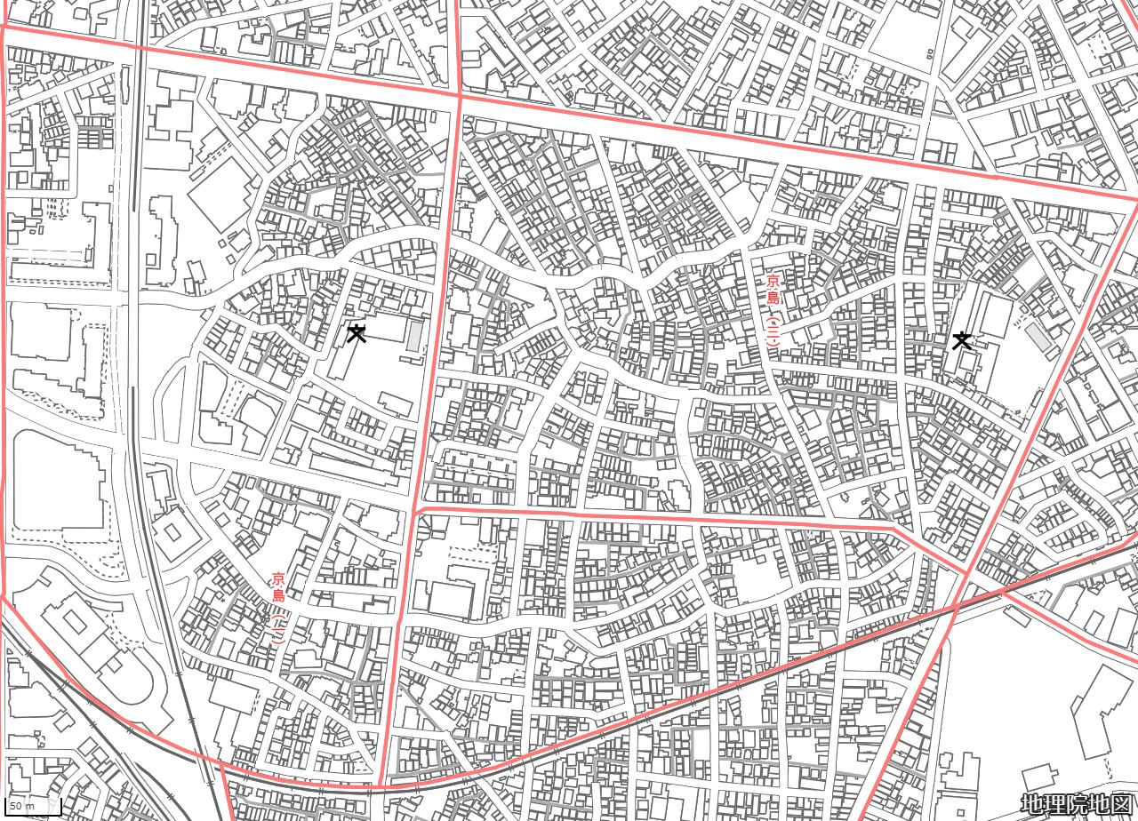 地図の内容は国土地理院が作成した時点の情報を反映しており、実際の現況とは異なる場合があります。現在は存在しない建物や道路、新たに整備された施設などが含まれることがありますので、あらかじめご了承ください。