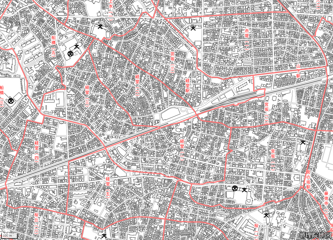 地図の内容は国土地理院が作成した時点の情報を反映しており、実際の現況とは異なる場合があります。現在は存在しない建物や道路、新たに整備された施設などが含まれることがありますので、あらかじめご了承ください。