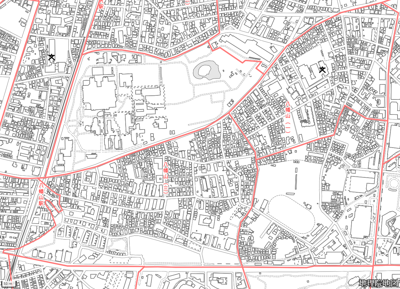 地図の内容は国土地理院が作成した時点の情報を反映しており、実際の現況とは異なる場合があります。現在は存在しない建物や道路、新たに整備された施設などが含まれることがありますので、あらかじめご了承ください。