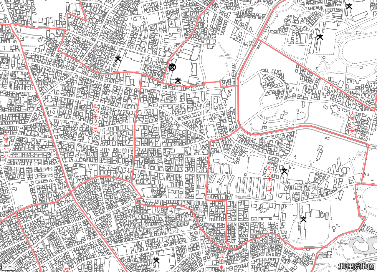 地図の内容は国土地理院が作成した時点の情報を反映しており、実際の現況とは異なる場合があります。現在は存在しない建物や道路、新たに整備された施設などが含まれることがありますので、あらかじめご了承ください。