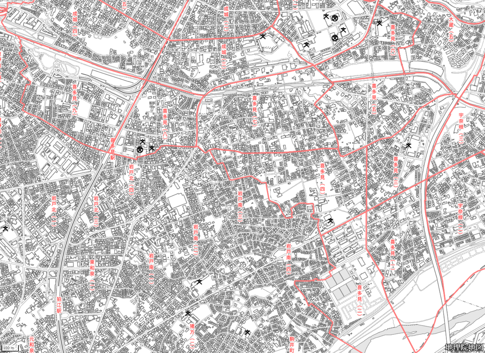 地図の内容は国土地理院が作成した時点の情報を反映しており、実際の現況とは異なる場合があります。現在は存在しない建物や道路、新たに整備された施設などが含まれることがありますので、あらかじめご了承ください。