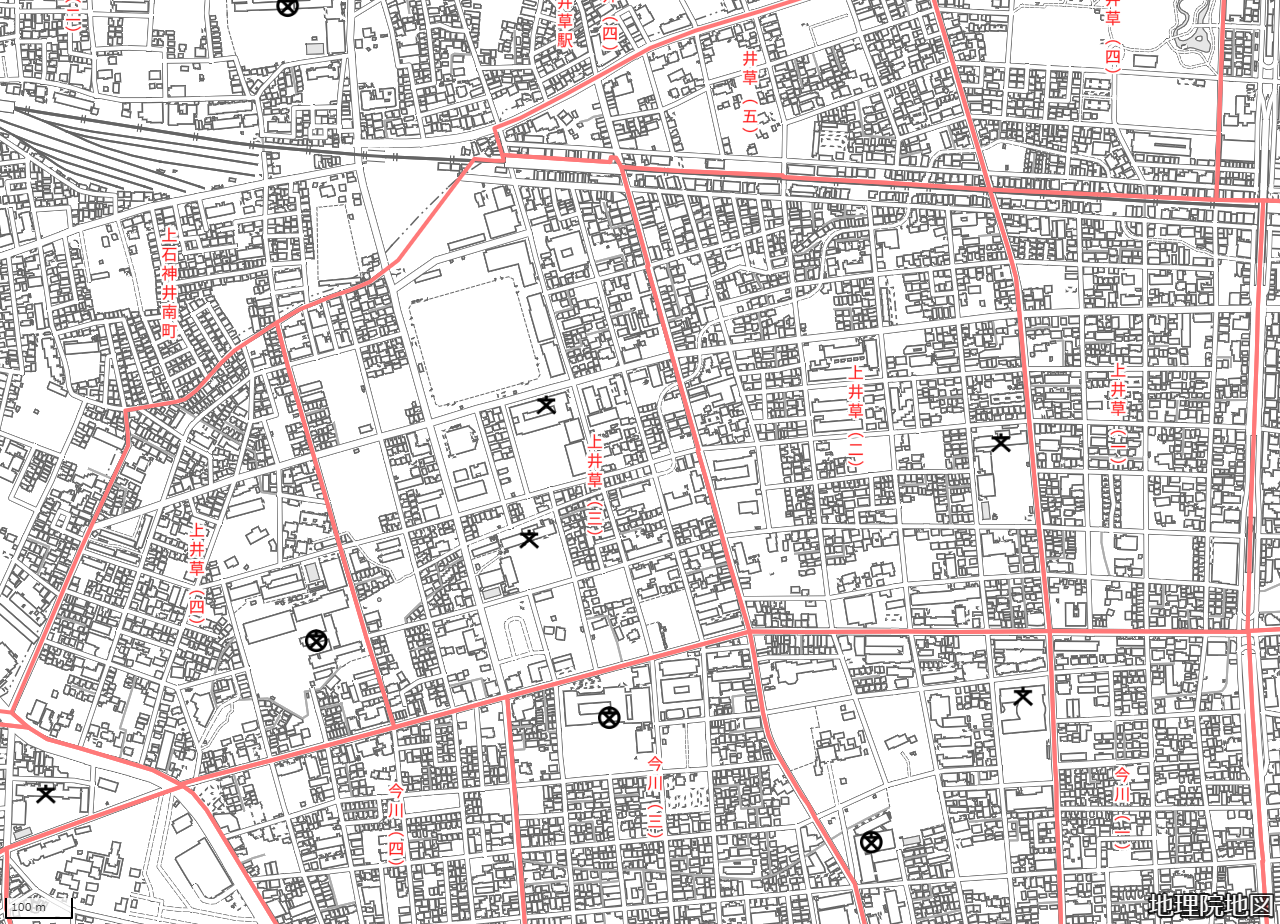 地図の内容は国土地理院が作成した時点の情報を反映しており、実際の現況とは異なる場合があります。現在は存在しない建物や道路、新たに整備された施設などが含まれることがありますので、あらかじめご了承ください。