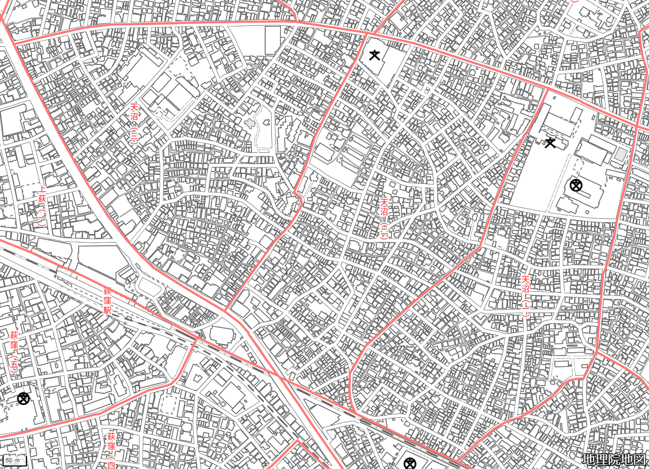 地図の内容は国土地理院が作成した時点の情報を反映しており、実際の現況とは異なる場合があります。現在は存在しない建物や道路、新たに整備された施設などが含まれることがありますので、あらかじめご了承ください。