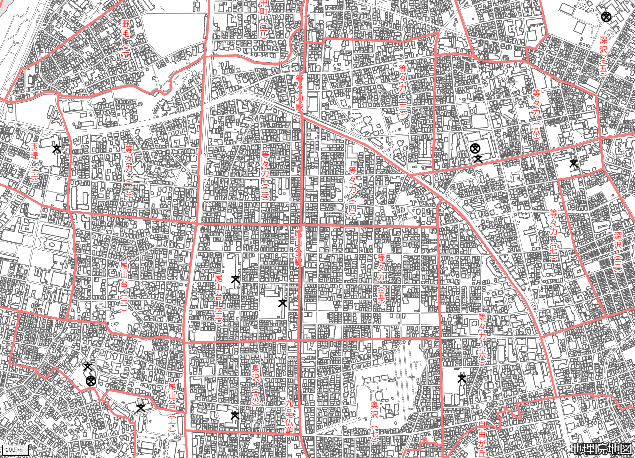 地図の内容は国土地理院が作成した時点の情報を反映しており、実際の現況とは異なる場合があります。現在は存在しない建物や道路、新たに整備された施設などが含まれることがありますので、あらかじめご了承ください。