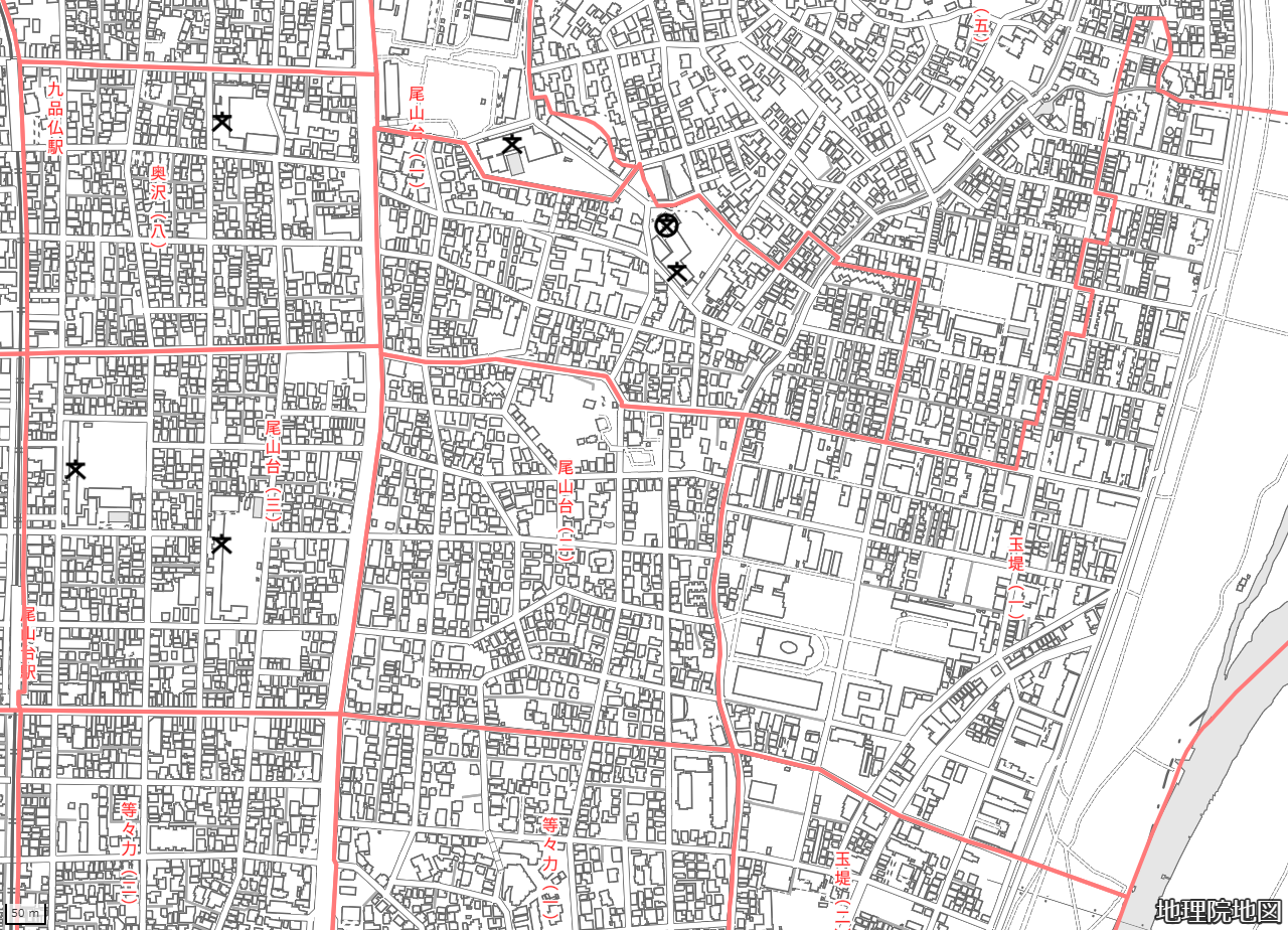 地図の内容は国土地理院が作成した時点の情報を反映しており、実際の現況とは異なる場合があります。現在は存在しない建物や道路、新たに整備された施設などが含まれることがありますので、あらかじめご了承ください。