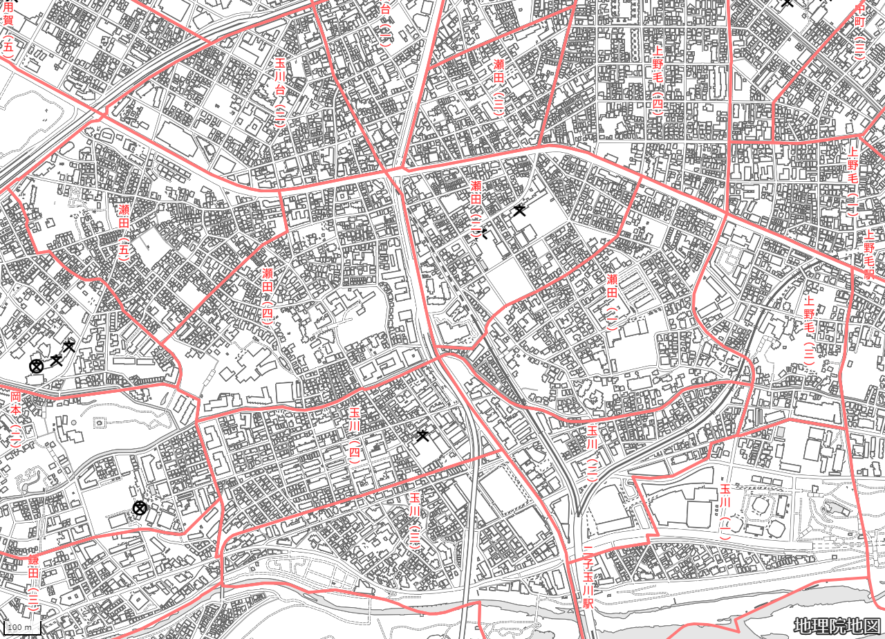 地図の内容は国土地理院が作成した時点の情報を反映しており、実際の現況とは異なる場合があります。現在は存在しない建物や道路、新たに整備された施設などが含まれることがありますので、あらかじめご了承ください。