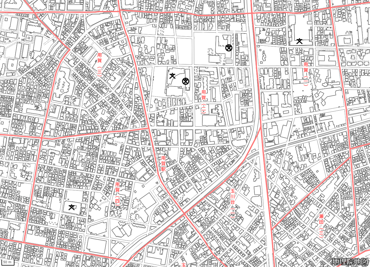 地図の内容は国土地理院が作成した時点の情報を反映しており、実際の現況とは異なる場合があります。現在は存在しない建物や道路、新たに整備された施設などが含まれることがありますので、あらかじめご了承ください。