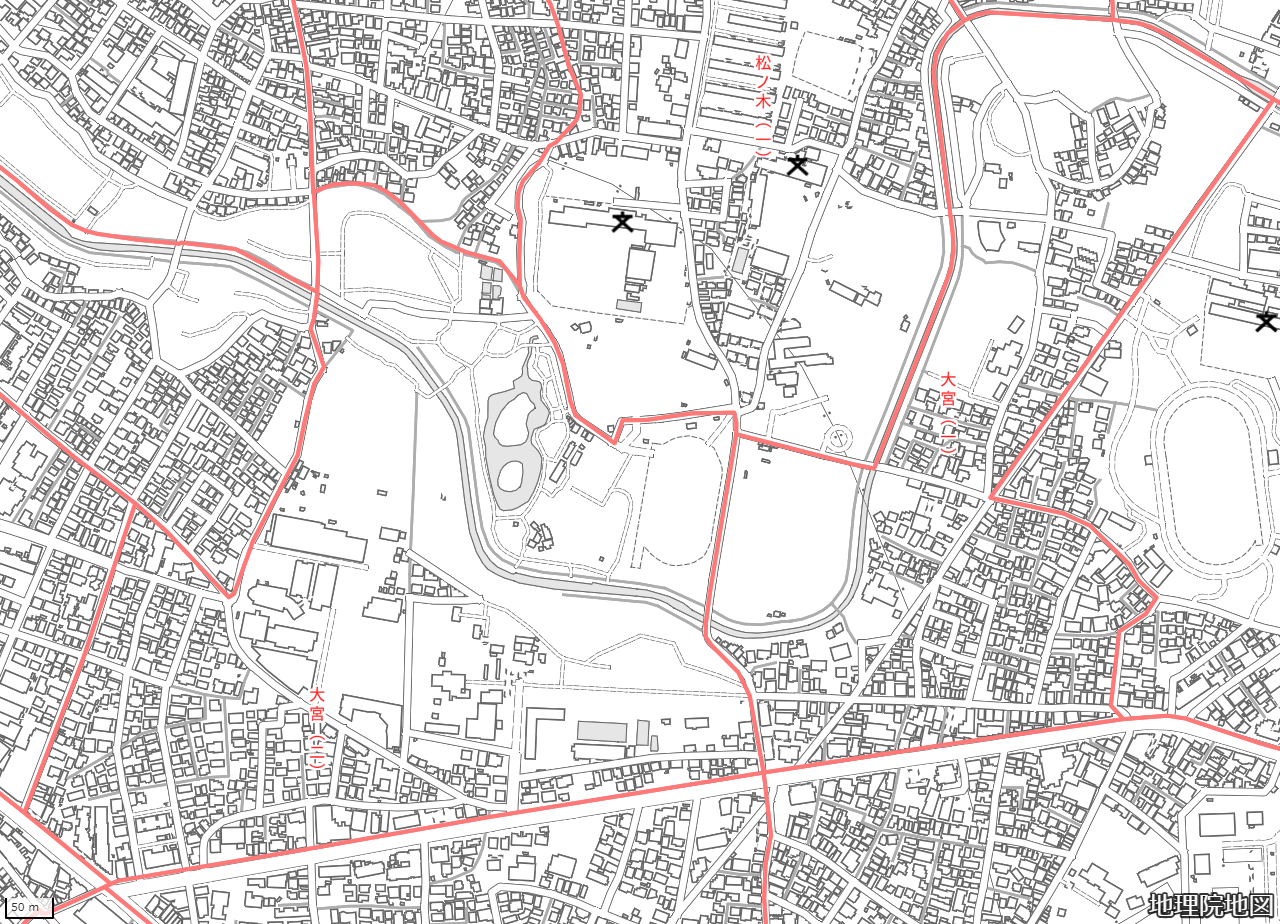 地図の内容は国土地理院が作成した時点の情報を反映しており、実際の現況とは異なる場合があります。現在は存在しない建物や道路、新たに整備された施設などが含まれることがありますので、あらかじめご了承ください。