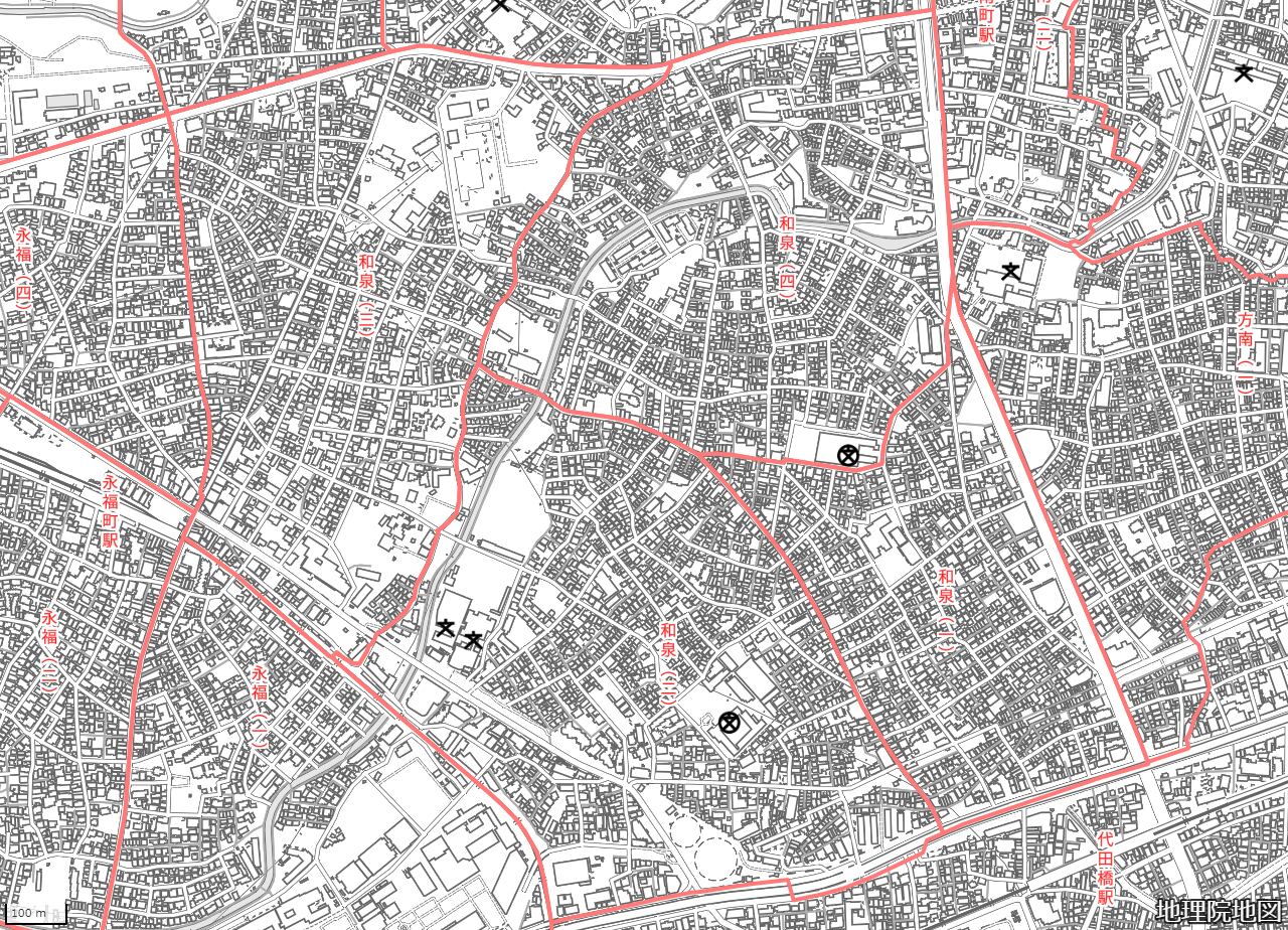 地図の内容は国土地理院が作成した時点の情報を反映しており、実際の現況とは異なる場合があります。現在は存在しない建物や道路、新たに整備された施設などが含まれることがありますので、あらかじめご了承ください。