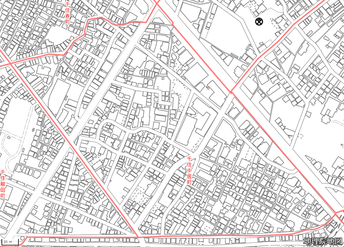 地図の内容は国土地理院が作成した時点の情報を反映しており、実際の現況とは異なる場合があります。現在は存在しない建物や道路、新たに整備された施設などが含まれることがありますので、あらかじめご了承ください。