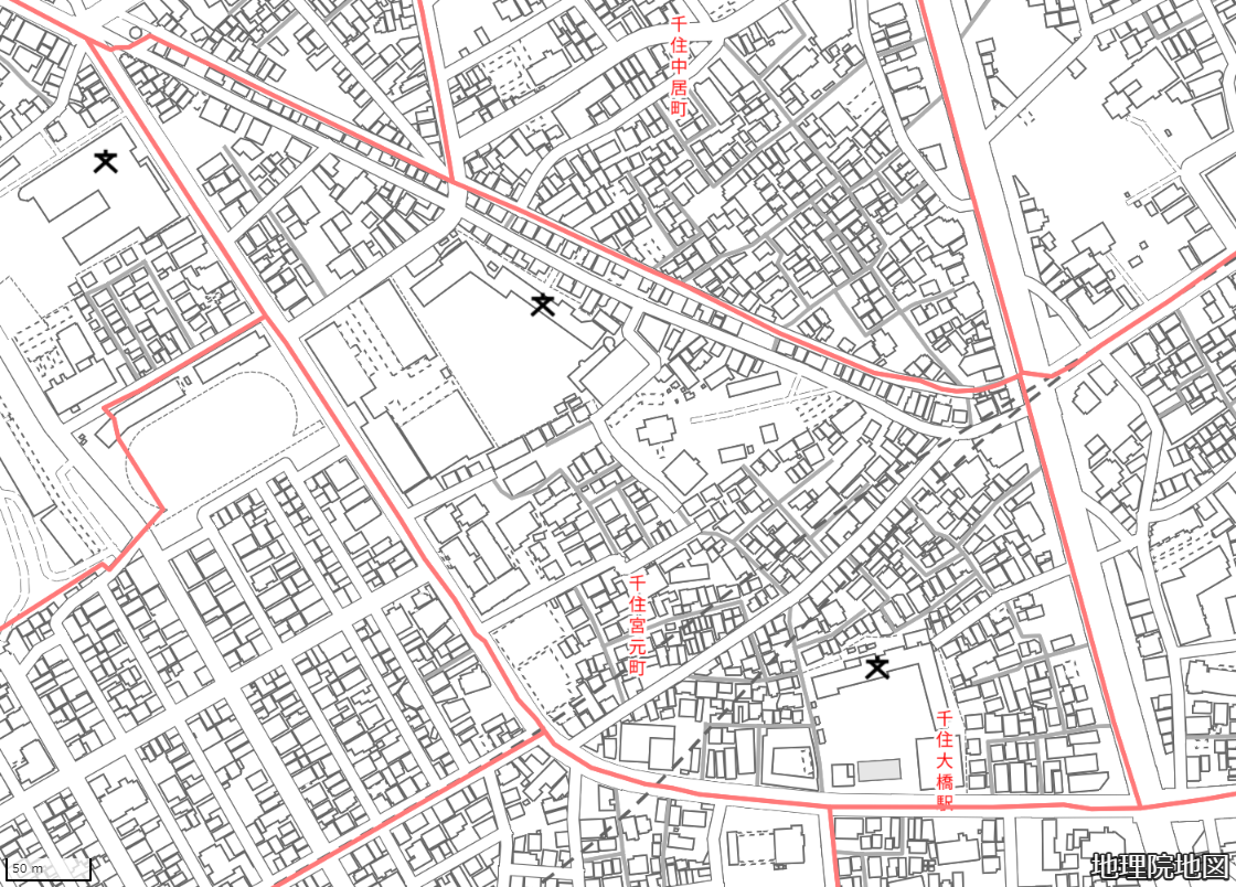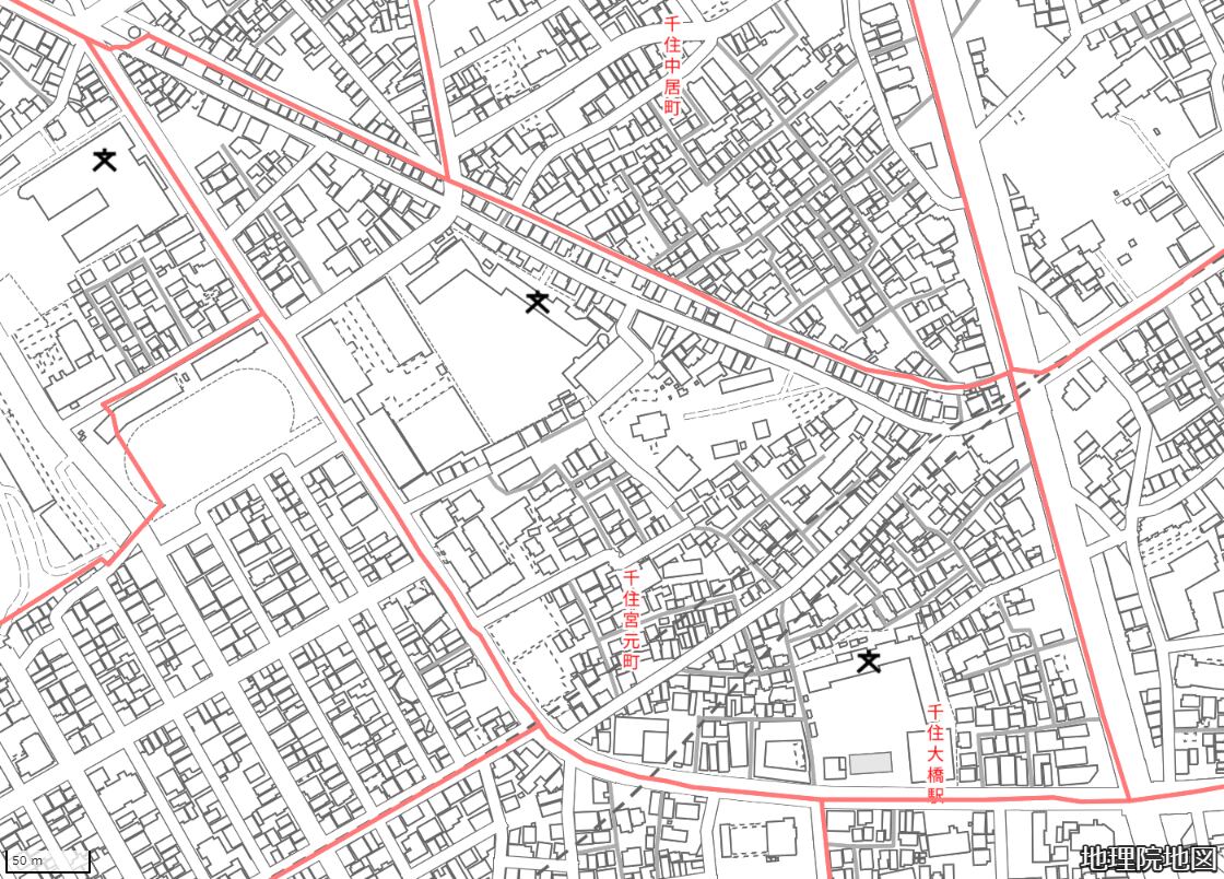 地図の内容は国土地理院が作成した時点の情報を反映しており、実際の現況とは異なる場合があります。現在は存在しない建物や道路、新たに整備された施設などが含まれることがありますので、あらかじめご了承ください。