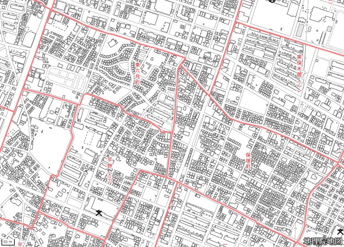 地図の内容は国土地理院が作成した時点の情報を反映しており、実際の現況とは異なる場合があります。現在は存在しない建物や道路、新たに整備された施設などが含まれることがありますので、あらかじめご了承ください。