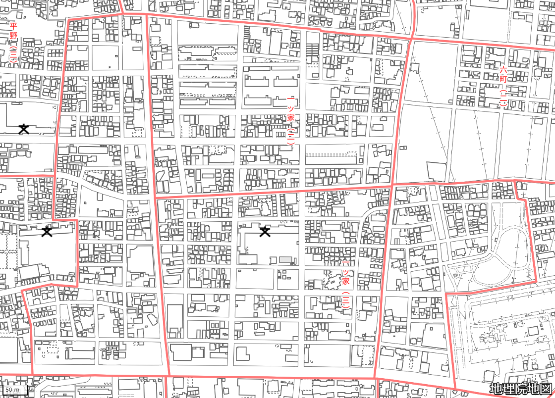 地図の内容は国土地理院が作成した時点の情報を反映しており、実際の現況とは異なる場合があります。現在は存在しない建物や道路、新たに整備された施設などが含まれることがありますので、あらかじめご了承ください。