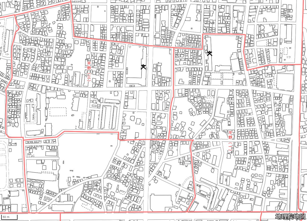 地図の内容は国土地理院が作成した時点の情報を反映しており、実際の現況とは異なる場合があります。現在は存在しない建物や道路、新たに整備された施設などが含まれることがありますので、あらかじめご了承ください。