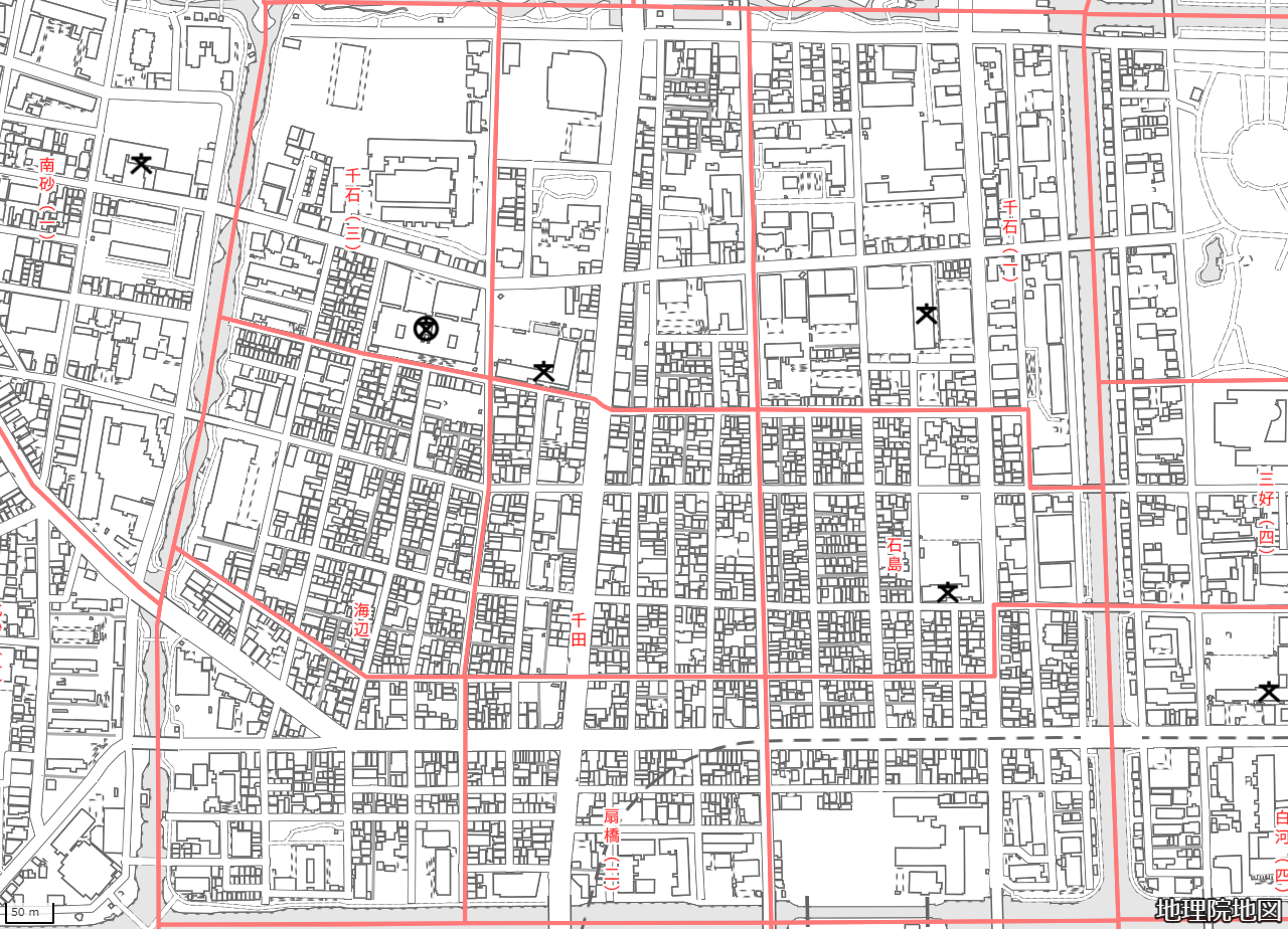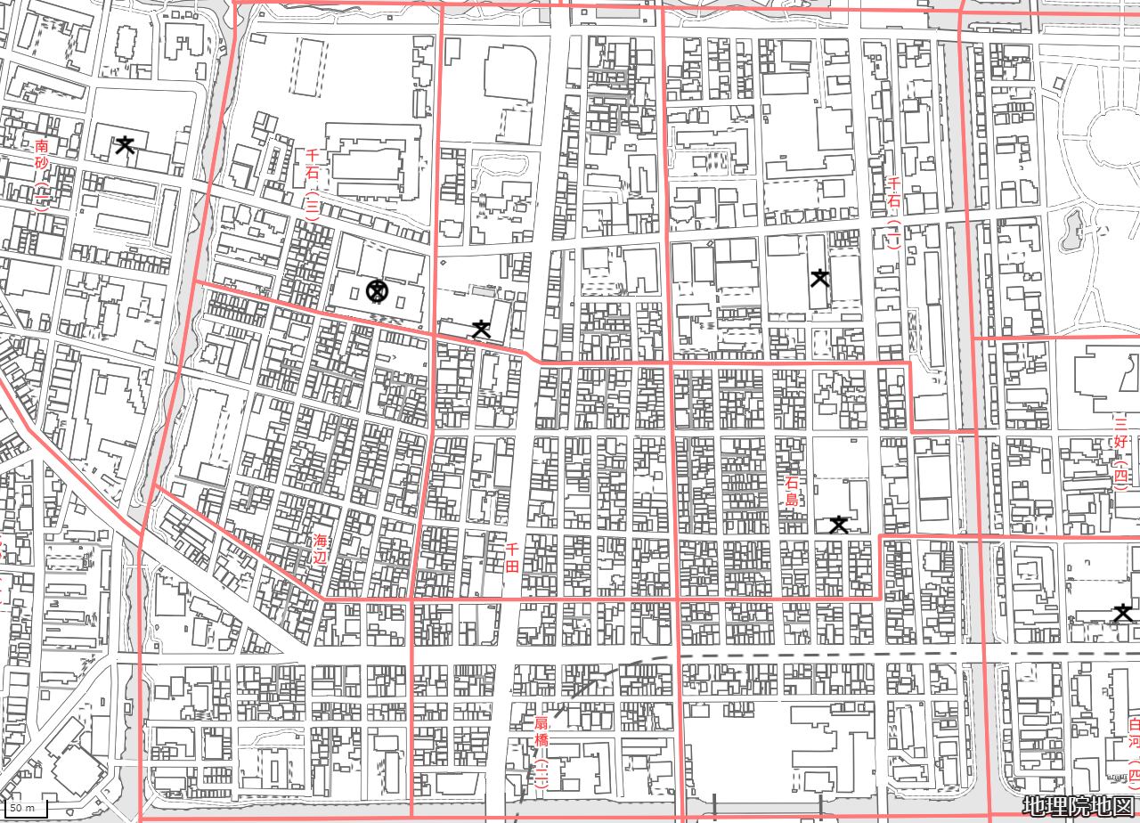地図の内容は国土地理院が作成した時点の情報を反映しており、実際の現況とは異なる場合があります。現在は存在しない建物や道路、新たに整備された施設などが含まれることがありますので、あらかじめご了承ください。