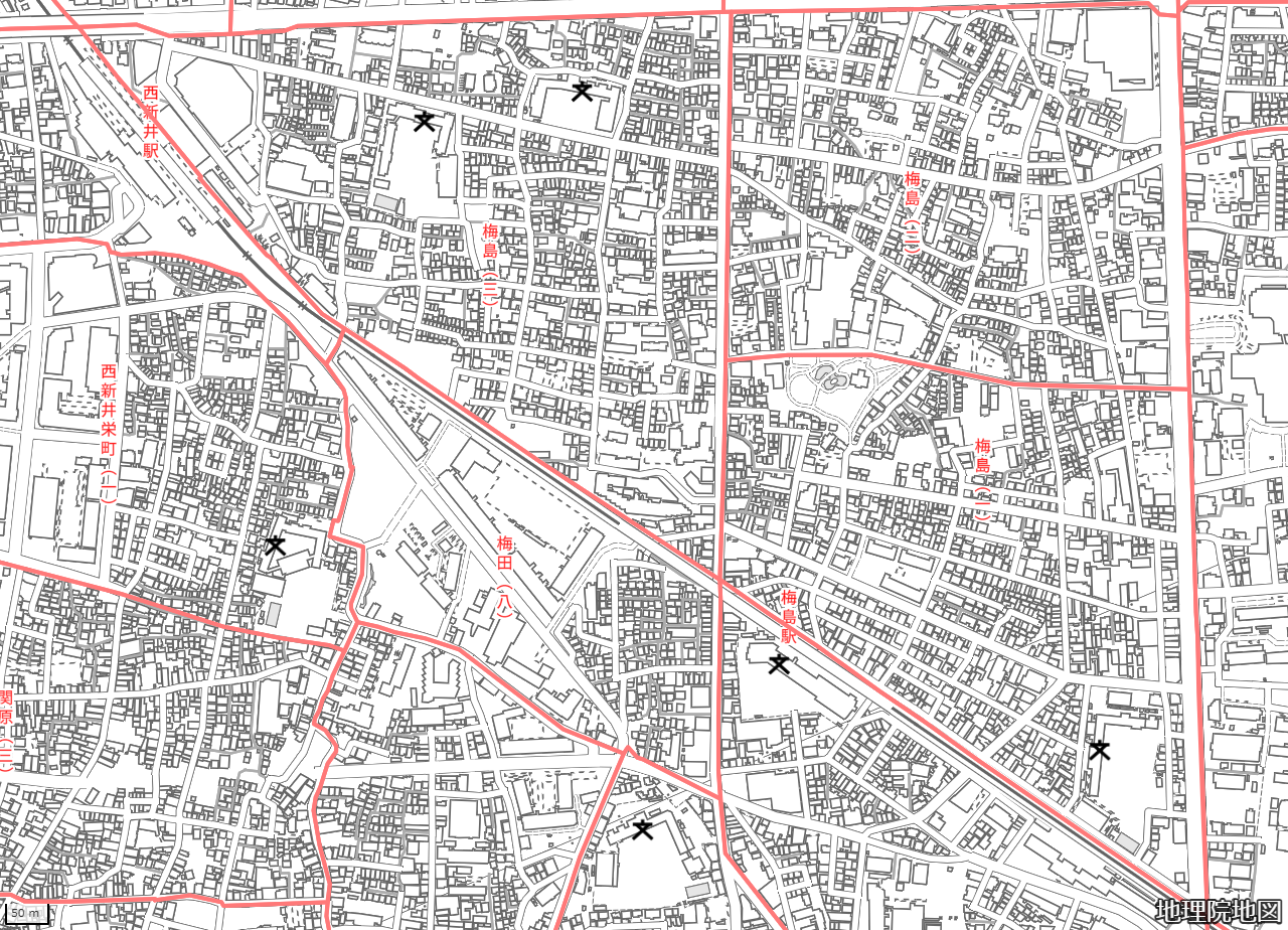 地図の内容は国土地理院が作成した時点の情報を反映しており、実際の現況とは異なる場合があります。現在は存在しない建物や道路、新たに整備された施設などが含まれることがありますので、あらかじめご了承ください。