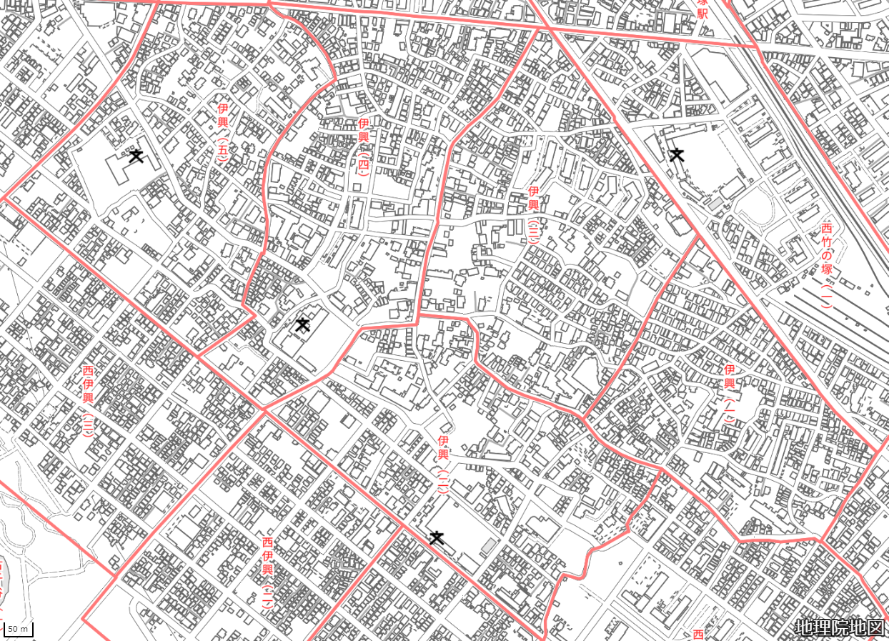 地図の内容は国土地理院が作成した時点の情報を反映しており、実際の現況とは異なる場合があります。現在は存在しない建物や道路、新たに整備された施設などが含まれることがありますので、あらかじめご了承ください。