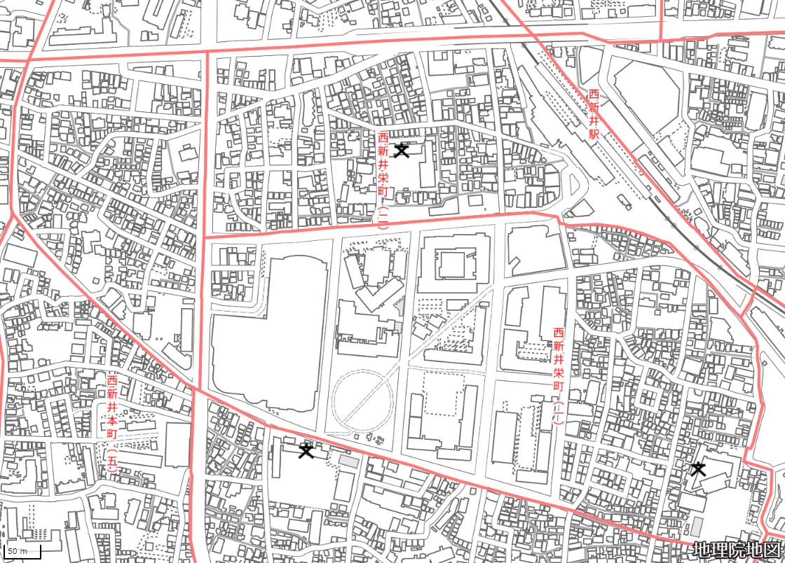地図の内容は国土地理院が作成した時点の情報を反映しており、実際の現況とは異なる場合があります。現在は存在しない建物や道路、新たに整備された施設などが含まれることがありますので、あらかじめご了承ください。