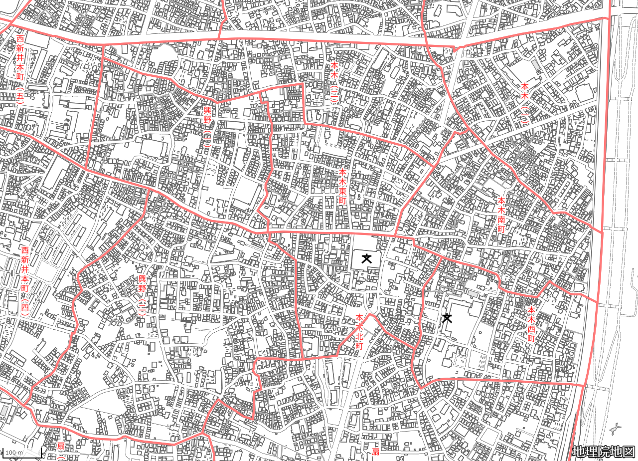 地図の内容は国土地理院が作成した時点の情報を反映しており、実際の現況とは異なる場合があります。現在は存在しない建物や道路、新たに整備された施設などが含まれることがありますので、あらかじめご了承ください。