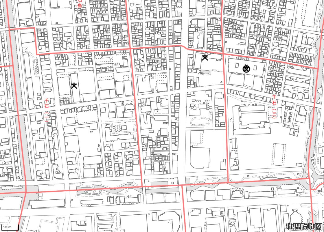 地図の内容は国土地理院が作成した時点の情報を反映しており、実際の現況とは異なる場合があります。現在は存在しない建物や道路、新たに整備された施設などが含まれることがありますので、あらかじめご了承ください。