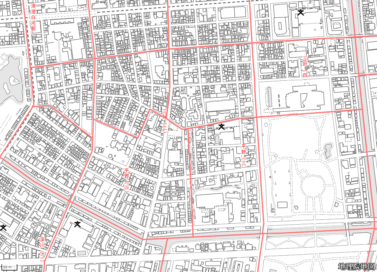 地図の内容は国土地理院が作成した時点の情報を反映しており、実際の現況とは異なる場合があります。現在は存在しない建物や道路、新たに整備された施設などが含まれることがありますので、あらかじめご了承ください。