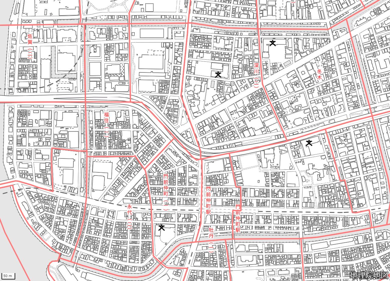 地図の内容は国土地理院が作成した時点の情報を反映しており、実際の現況とは異なる場合があります。現在は存在しない建物や道路、新たに整備された施設などが含まれることがありますので、あらかじめご了承ください。