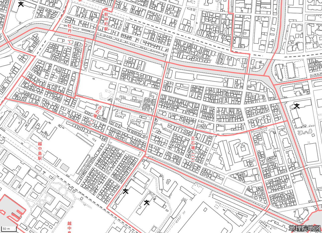地図の内容は国土地理院が作成した時点の情報を反映しており、実際の現況とは異なる場合があります。現在は存在しない建物や道路、新たに整備された施設などが含まれることがありますので、あらかじめご了承ください。