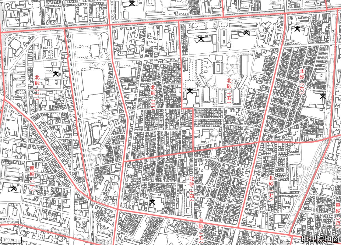 地図の内容は国土地理院が作成した時点の情報を反映しており、実際の現況とは異なる場合があります。現在は存在しない建物や道路、新たに整備された施設などが含まれることがありますので、あらかじめご了承ください。