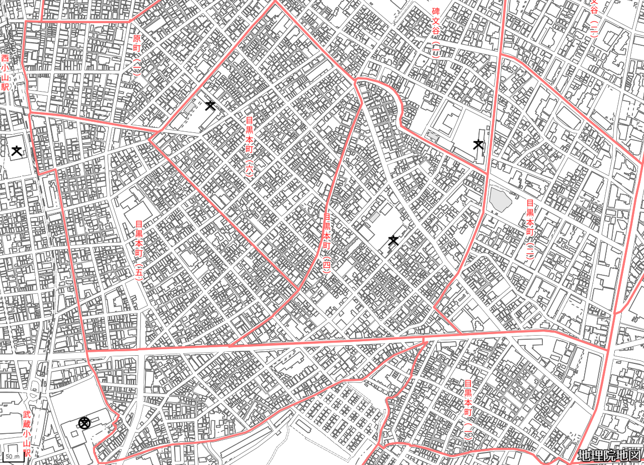 地図の内容は国土地理院が作成した時点の情報を反映しており、実際の現況とは異なる場合があります。現在は存在しない建物や道路、新たに整備された施設などが含まれることがありますので、あらかじめご了承ください。