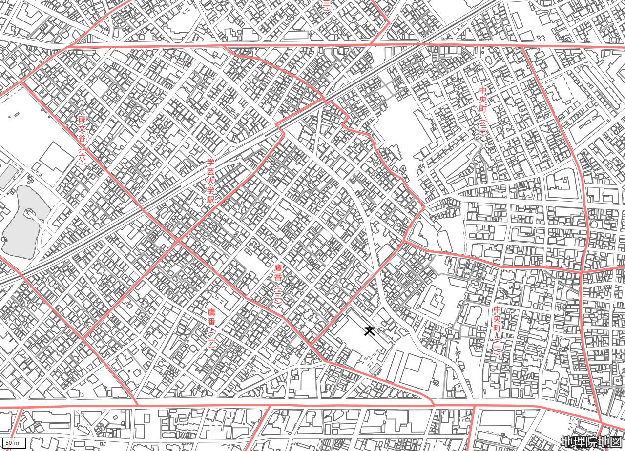 地図の内容は国土地理院が作成した時点の情報を反映しており、実際の現況とは異なる場合があります。現在は存在しない建物や道路、新たに整備された施設などが含まれることがありますので、あらかじめご了承ください。