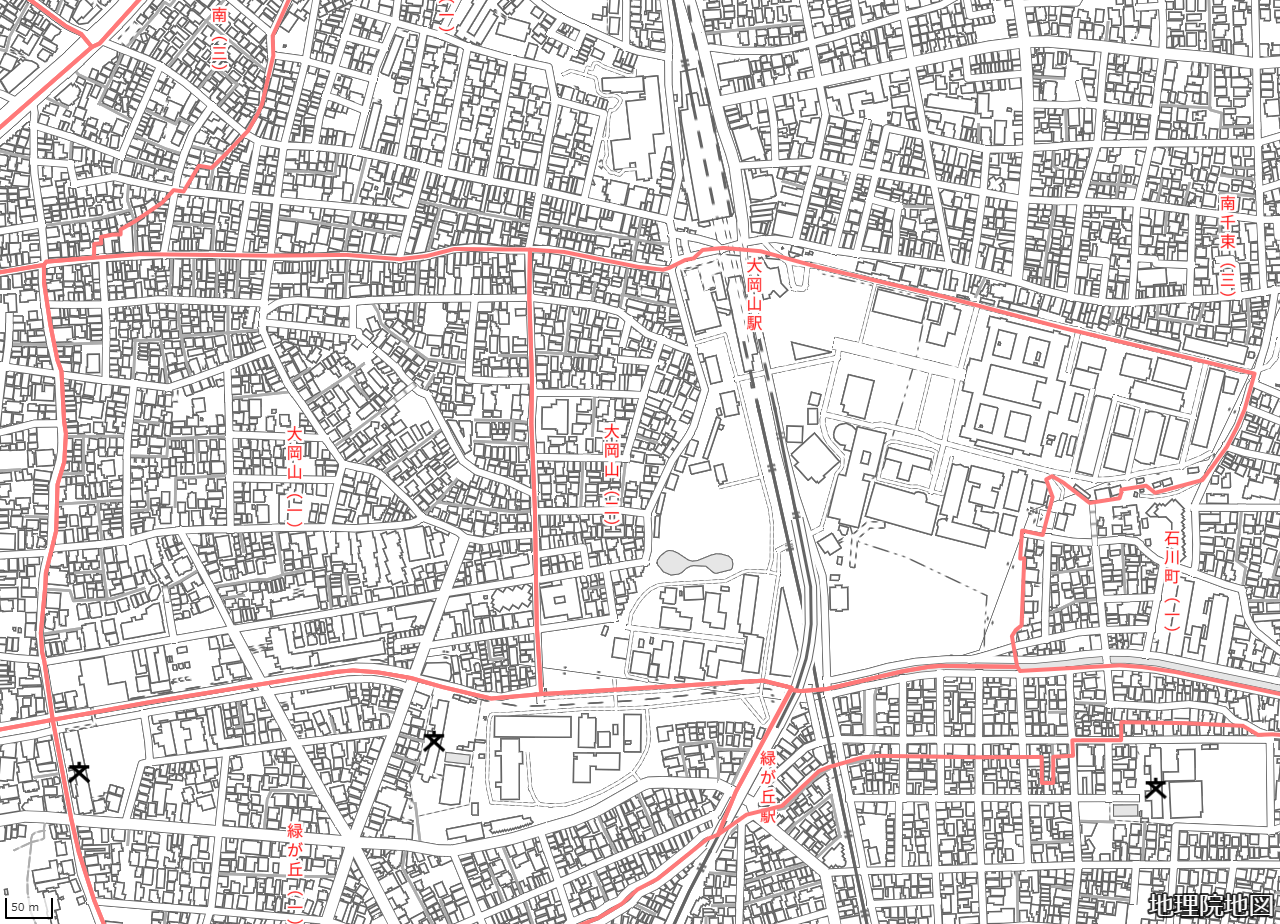 地図の内容は国土地理院が作成した時点の情報を反映しており、実際の現況とは異なる場合があります。現在は存在しない建物や道路、新たに整備された施設などが含まれることがありますので、あらかじめご了承ください。